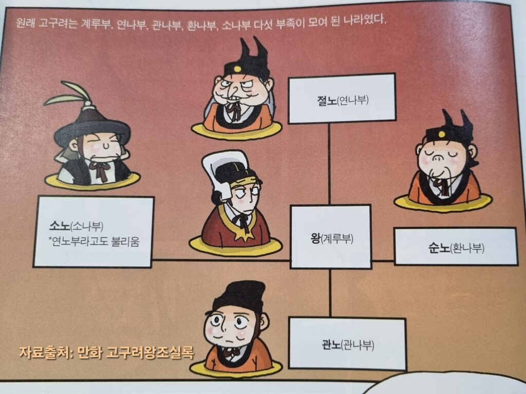 왕이 된 태조왕(궁)은 강력한 지도력을 발휘해 작은 연맹체 나라들의 지도자들을 중앙귀족으로 흡수했습니다. 귀족들을 5부로 개편해 연맹왕국에서 벗어나 중앙집권체제를 이루었습니다. 계루부에서만 왕을 배출할 수 있게 했고 소노부에서는 왕비를 배출, 절노부는 왕실과 혼인할 수 있게 했습니다. 순노부와 관노부에게는 높은 벼슬에 오를 수 있게 했습니다. 고구려 태조왕은 왕의 권한을 확대하는 과정에서 혈연 중심의 5부를 약화시키고 지역 중심의 5부로 개편했습니다.