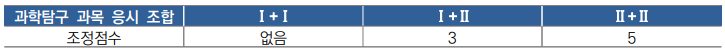 - 과학탐구 조정점수: 과학탐구 과목 응시 조합에 따라 조정점수를 부여합니다.