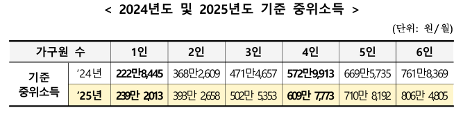 위의 금액은 100% 기준이기 때문에 각종 지원 제도 기준인 50%, 60%, 100%, 120%, 150%, 250% 계산은 위의 금액에서 곱해주면 됩니다. 예로 교육 급여 기준인 50%는 1인 가구 기준 2,392,013원 x 50% = 1,196,006원 으로 산정됩니다. 5인 가족 기준으로 청년도약계좌를 보면 7,108,192원 x 250%=17,770,480