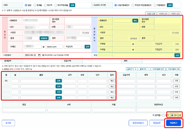 공급자와 공급받는 자의 정보, 품목, 공급가액 등을 입력하고 발행합니다.