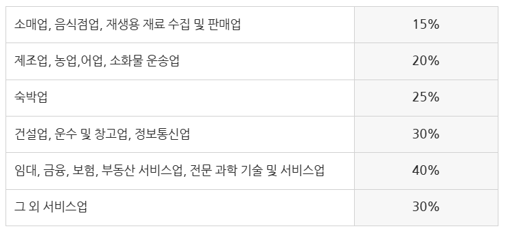 업종별 부가가치율은 특정업종에 따라 다르게 적용되는 부가가치세의 비율을 말하는데 정부에서 간이과세자의 세금납부의 부담을 덜어주기 위해 정해 놓은 비율입니다.
