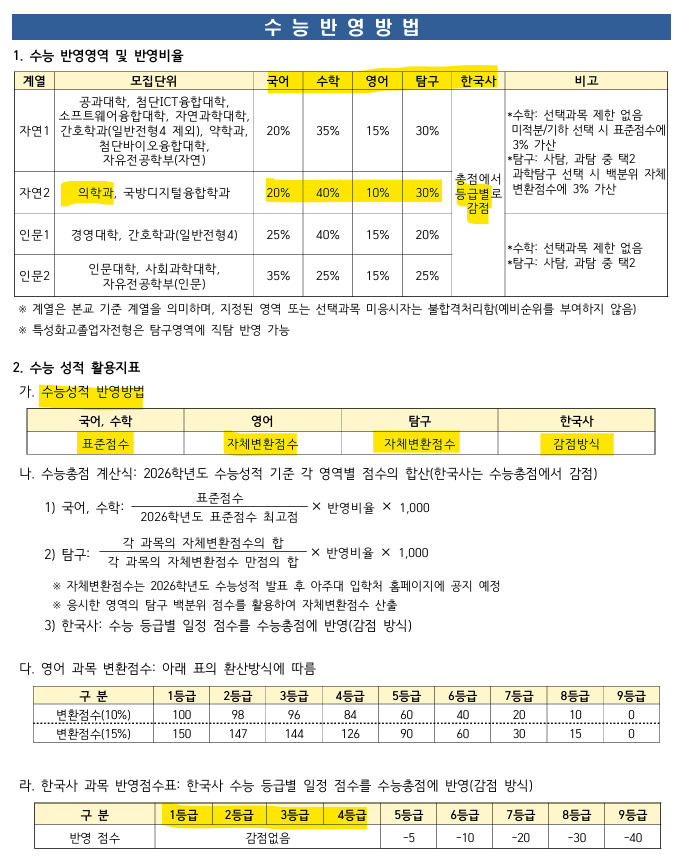 🔆 아주대학교 의학과 수능 반영비율은 수학이 40%, 국어 20%, 과학 30%, 영어 10% 로 한국사는 등급별로 감점을 하는 방식을 갖고 있습니다. 국어, 수학은 표준점수를 반영하고 영어, 탐구는 자체변환점수를 반영합니다. 자체변환점수는 2026년 수학능력시험을 본 후 학교내에서 자체적으로 자체변환점수를 공개합니다.