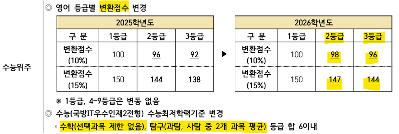 🔆 영어 등급별 변환점수가 변경되었습니다. 2등급은 변환점수(10%)가 기존 96점에서 98점으로, 변환점수(15%)는 기존 144점에서 147점으로 증가했습니다. 3등급은 변환점수(10%)가 기존 92점에서 96점으로, 변환점수(15%)는 기존 138점에서 144점으로 변경되었습니다.