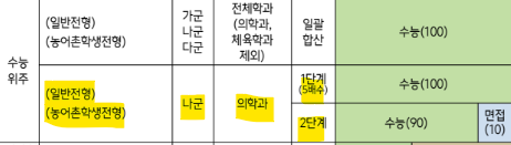 🔆 정원외 나군 수능(농어촌학생전형) 의학과 모집 인원은 1명입니다.