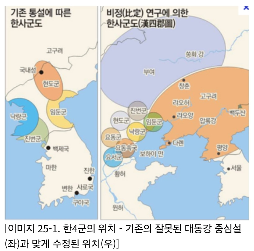 한사군의 위치는 현재까지 역사적 사료와 유물 등을 근거로 하여 추정되고 있고 정확한 위치는 학계의 의견이 충돌하고 있습니다. 위의 그림에서 보듯, 왼쪽 그림은 한사군이 평양, 강원도 북부와 함경남도 동부, 황해도에 있다고 보는 학계의 이야기고 오른쪽 그림은 한사군이 허베이성, 베이징시, 산시성 근처라는 주장을 볼 수 있습니다. 일제 강점기를 겪은 조선의 역사가 잘못되었는지 잘 살펴봐야 할 때라고 생각됩니다.